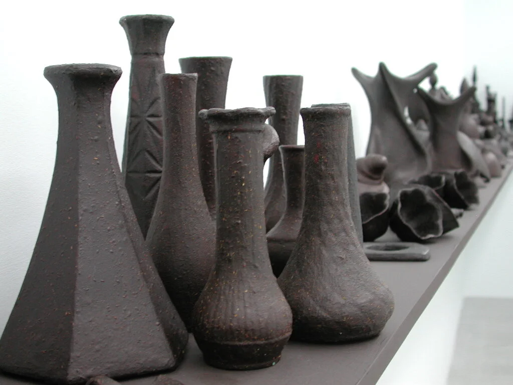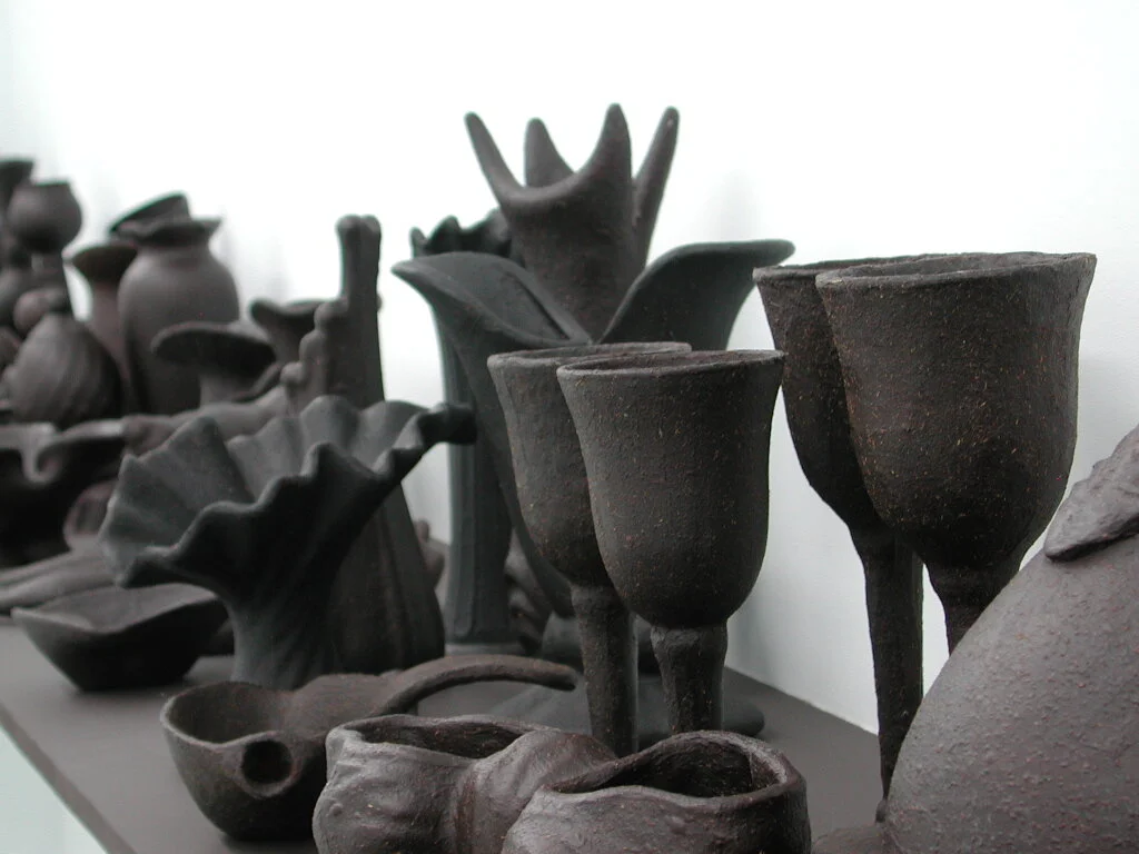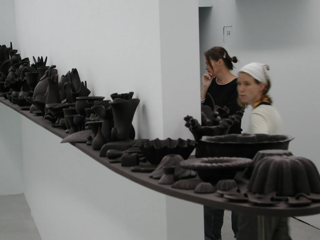 [e(ate)n] … consists of an installation that resembles a banquet table replete with recipients, dishes and other utensils, and recalls the art of hospitality … the tomato-paste covered vessels were red, like living flesh .. over time [they] turned purple, almost black … conjur[ing] up the transformation of the human body, aging and drying out as the years pass … With e(ate)n … we witness a changeover from container to contained and an inside-outing of the flesh … now in plain sight. By analogy it becomes ours. And being subject to putrefaction, it brings to mind our eventual death. Looking at it arouses feelings and emotions, and we are interpellated, touched at the very core of our being.